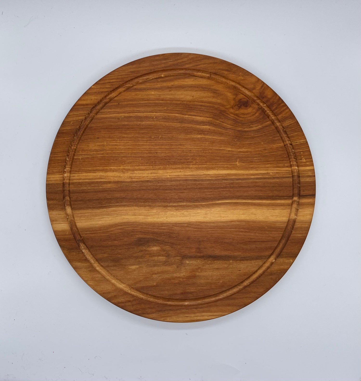 Das Brotzeitbrett rund hat einen Durchmesser von 25 cm und ist 1,5 cm dick.