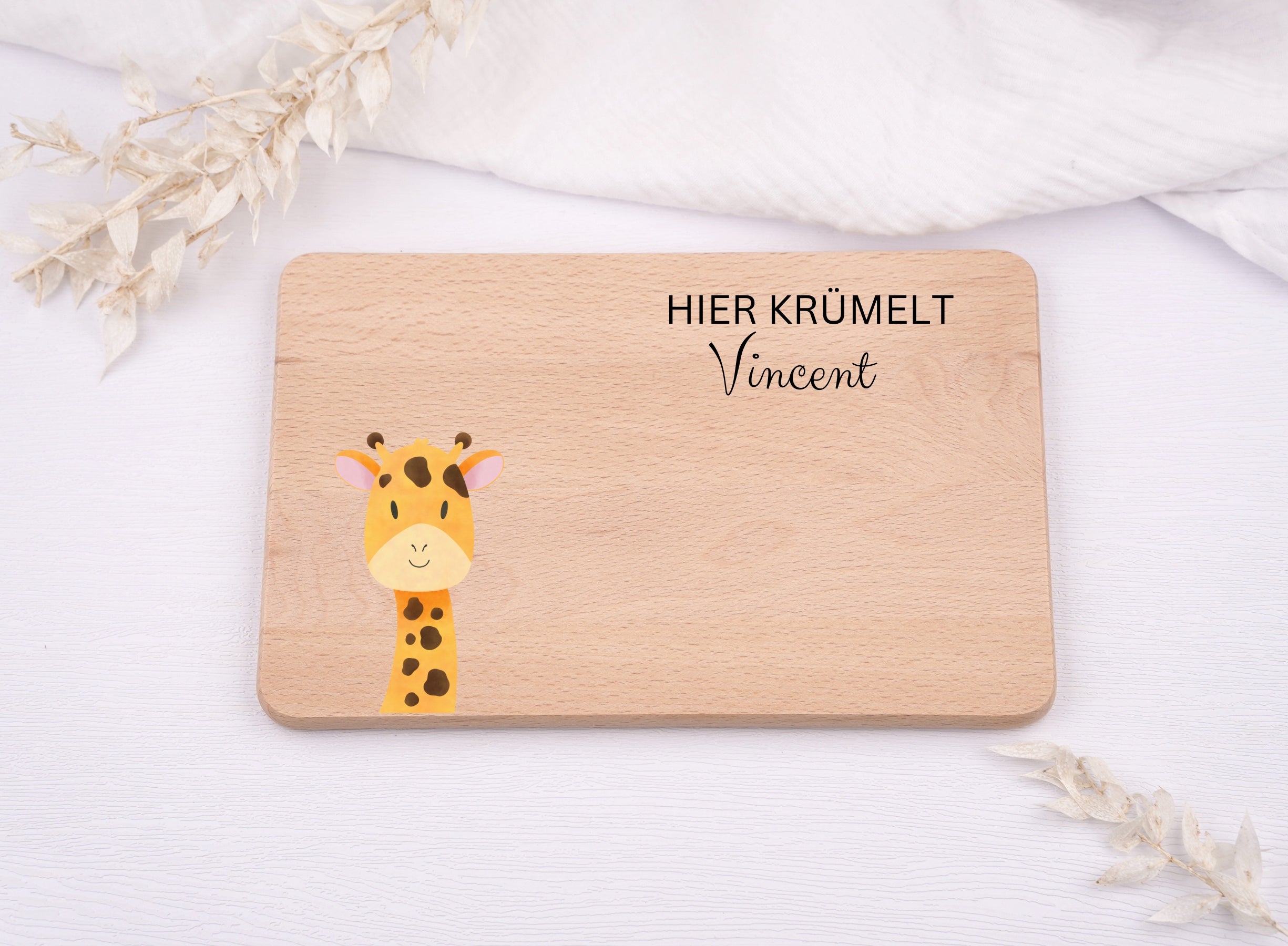 Personalisiertes Frühstücksbrettchen mit einer farbigen Giraffe und Namen eurer Wahl.