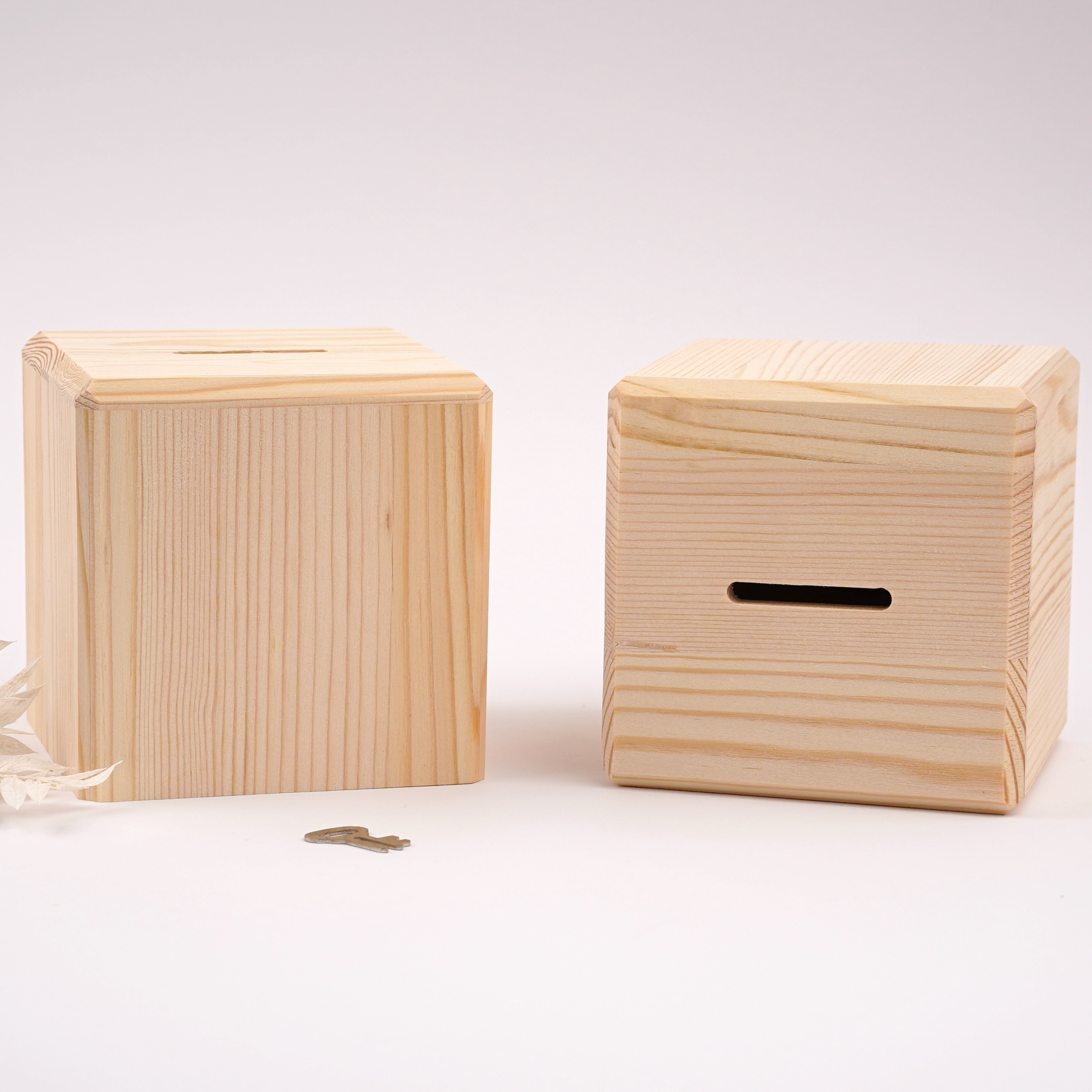Die Spardosen sind aus Kiefernholz. Das hochwertige verarbeitete Kiefernholz ist unbehandelt und Naturbelassen.